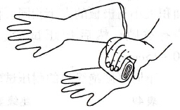①使用前須先檢查,將手套朝手指方向卷曲,檢查有無漏氣或裂口等,如圖78所示。如有漏氣或裂口,則不能使用。